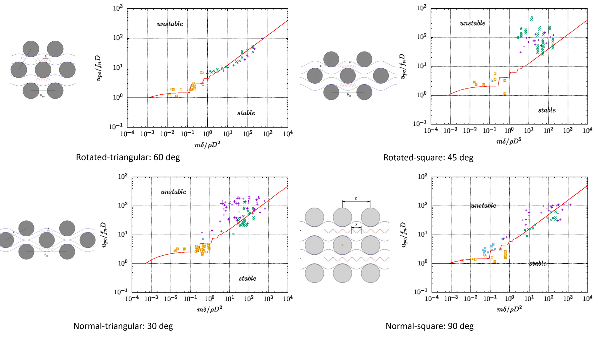 Model predictions of the critical reduced velocity along side the experimental data for fluidelastic instability