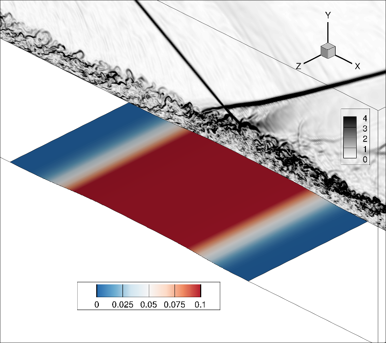 Transitional SBLI control using surface morphing. Surface temperature in uncontrolled and controlled cases. (Top view, flow from left to right)