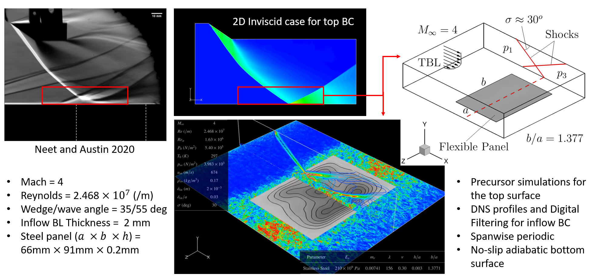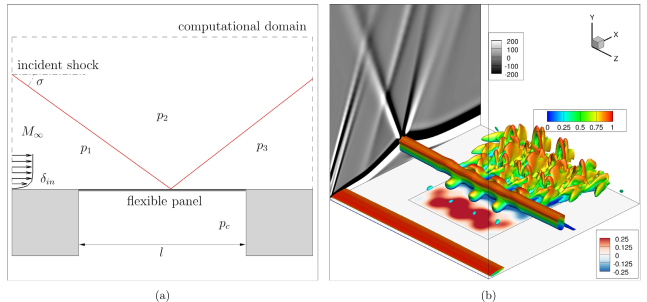 Transitional SBLI over a flexible panel. Geometry schematic (left) and flow fields (right)